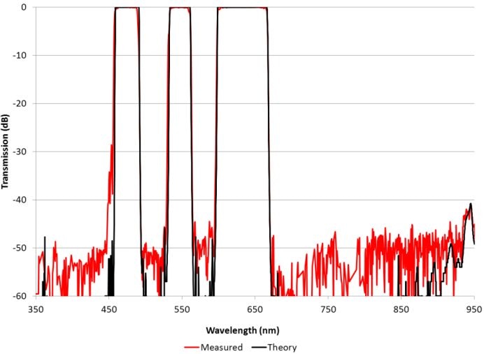 Figure 10. Triband optical filter in the visible showing high transmission and steep slopes