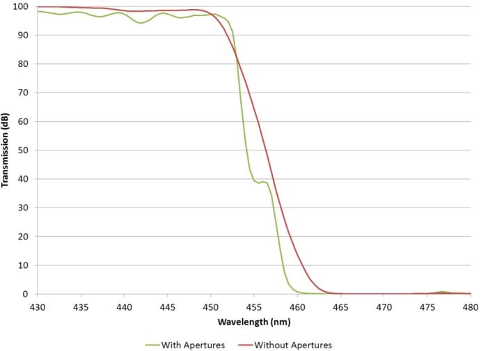 With this filter, it is important because any scattered light in the high transmission wavelength regions can reach the detector and add to the detected signal due to the narrow blocking region. This restricts the minimum light level the detector sees when in the blocking region, reducing the dynamic range of the detector.