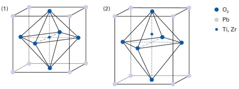 Perovskite crystal structure of PZT (1) Structure above Curie temperature, with Ti or Zr in non-piezoelectric, symmetrical cubic structure. (2) Structure below Curie temperature, showing the non-symmetrical tetragonal structure which allows piezoelectric conversion (Image: PI Ceramic)
