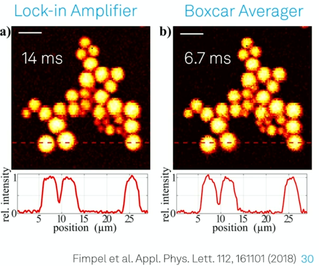 For certain applications, such as stimulated Raman microscopy, researchers have shown that boxcar averaging can achieve the same signal-to-noise ratio in roughly half the measurement time compared to lock-in detection.