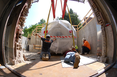 Workers move the MRI scanner into place through a cutout in the wall of MVR Hall