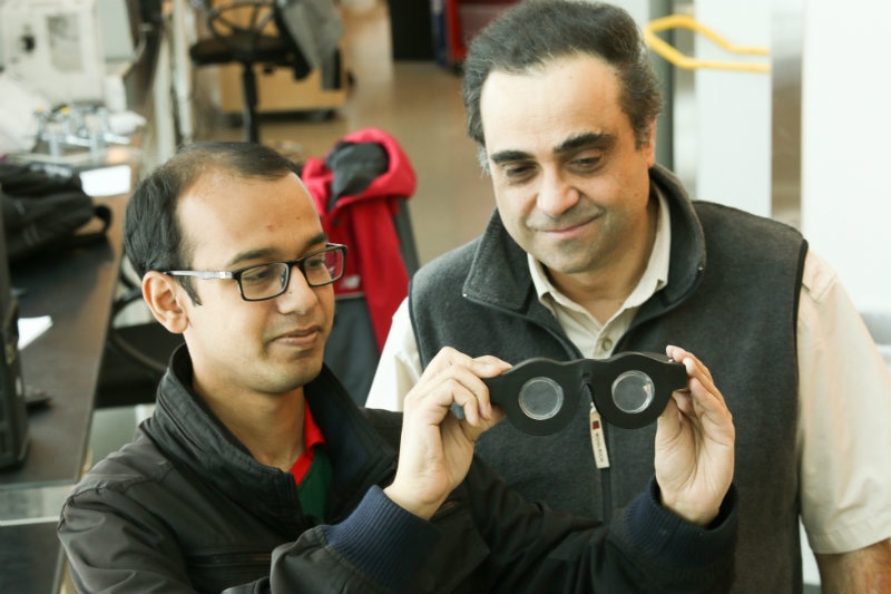 Mastrangelo, right, and doctoral student Nazmul Hasan, led the team that developed the smart glasses. (credit: Dan Hixson, University of Utah College of Engineering.)