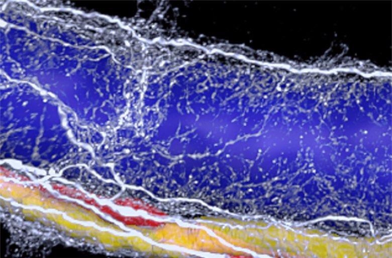 Sympathetic nerves (white) around the portal vein (blue), the bile duct (yellow), and the hepatic artery (red) in the liver. Image Credit: Csaba Adori et al., Science Advances, July 2021.