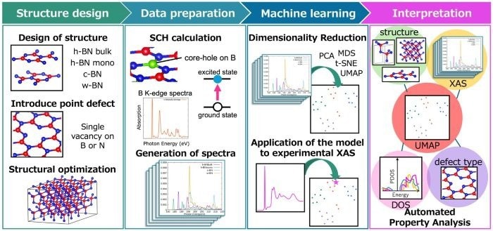 The team first generated XAS data for three different phases of boron nitride (BN) with different atomic structures, along with their defect analogues. The XAS data were generated using theoretical calculations based on fundamental physics and validated using experimental data.