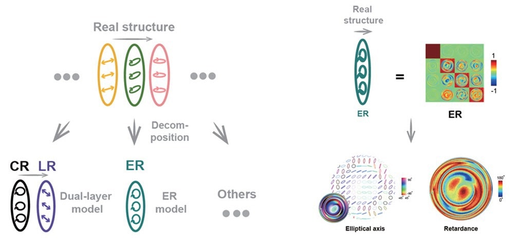 In polarization analysis, the real structure of a retarder sample may consist of multiple layers or a continuous, non-layered structure (left). Conventional approaches typically model the sample as a circular retarder (CR) followed by a linear retarder (LR), which may lead to misinterpretations. A method that employs an elliptical retarder (ER) model avoids this issue by characterizing the overall properties of any retarder without requiring prior knowledge of its internal structure. On the right, an example of a liquid-crystal droplet, which has a continuous, nonlayered structure. Its ER decomposition demonstrates the spatial distributions of the elliptical fast axis and retardance. Image Credit: R. Zhang et al., doi 10.1117/1.APN.4.6.066015