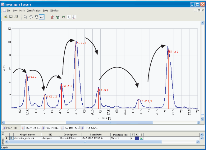 Step scanning offers 0.001° resolution, which allows for exact peak definition. Continuous digital scanning enables the quick capture of spectra at up to 327°/min for quick qualitative analysis. The peaks that correspond to the identified items are automatically identified.